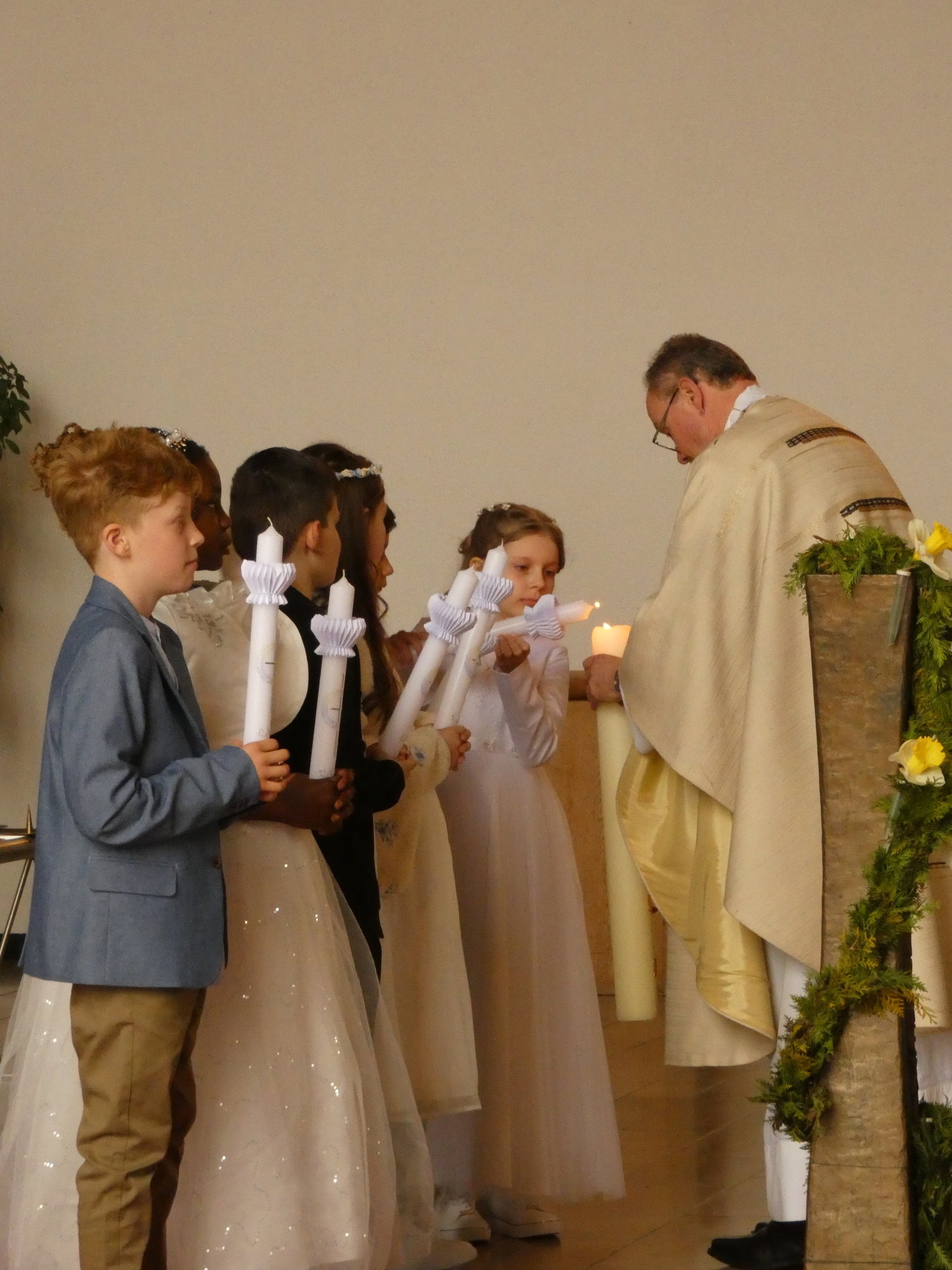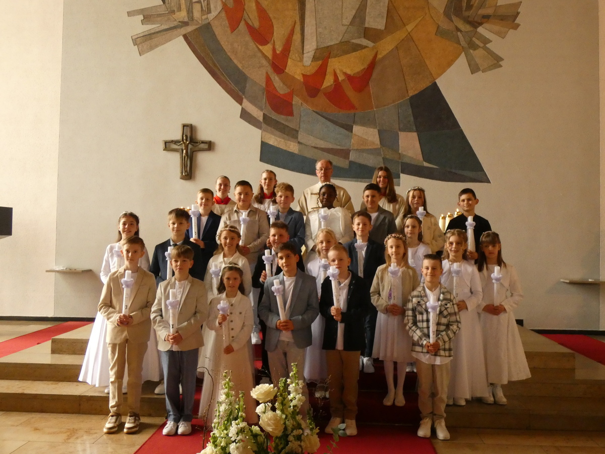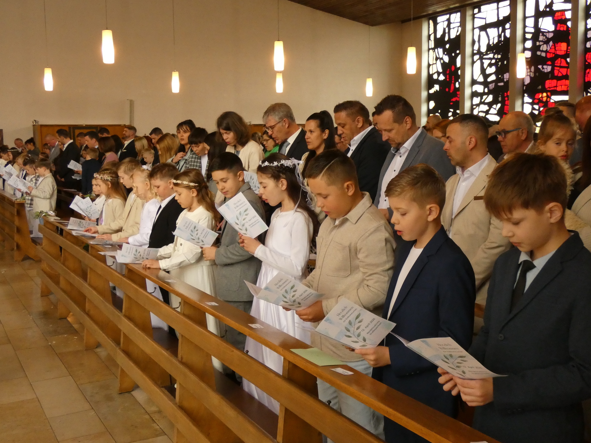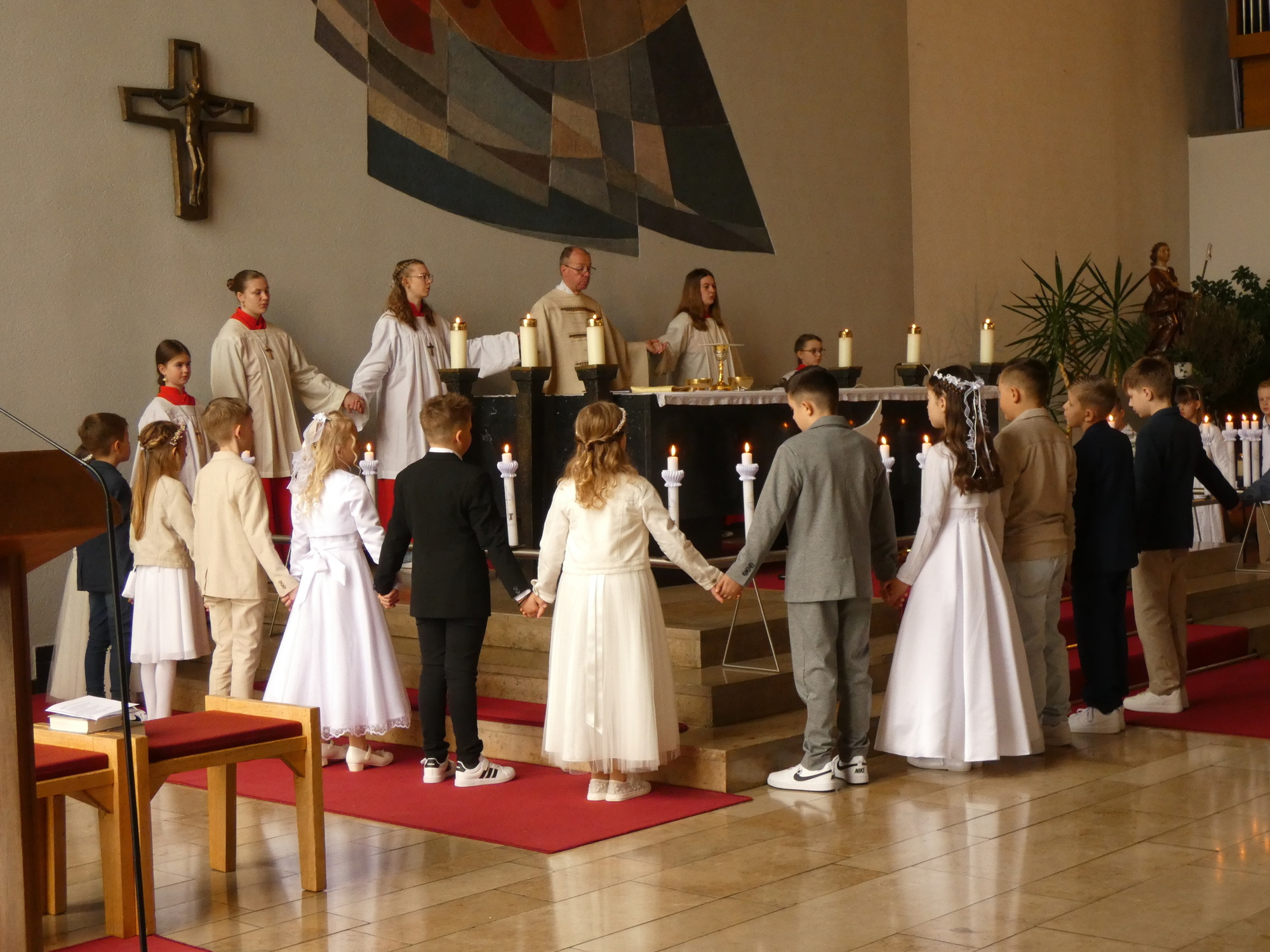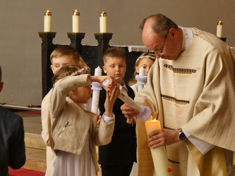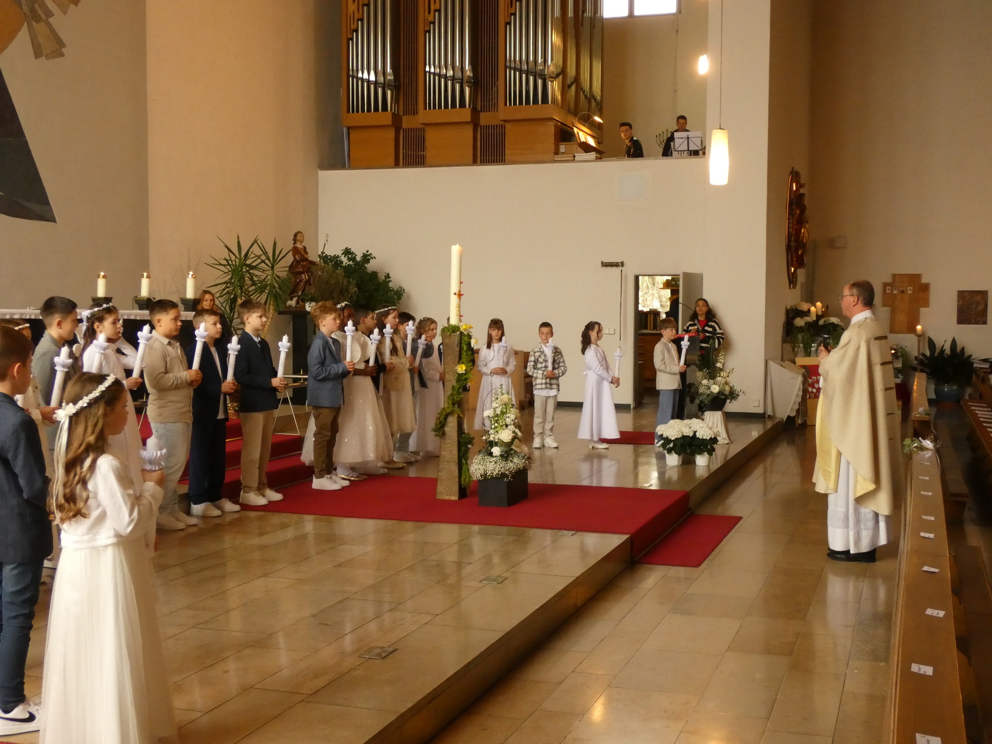 In den zurückliegenden Wochen wurden sie von Pfarrer Michael Prokschi wie auch dem Team der Katechetinnen begleitet und auf diesen Tag vorbereitet. Die Musikkapelle Keilberg spielte auf dem Weg zur Kirche und im voll besetzten Gotteshaus in Straßbessenbach fand der feierliche Gottesdienst statt. Zu Beginn entzündeten die Kinder ihre Kerzen an der Osterkerze und diese wurden dann rund um den Altar aufgestellt. Die Kinder brachten sich bei den Kyrierufen wie auch bei den Fürbitten ein, zum Vater unser und zum Empfang der Kommunion waren alle mit um den Altar versammelt. Der Festgottesdienst wurde musikalisch umrahmt von Niklas Steinzer an der Orgel sowie von den Trompetern Sebastian Lang und Klaus Winkel.