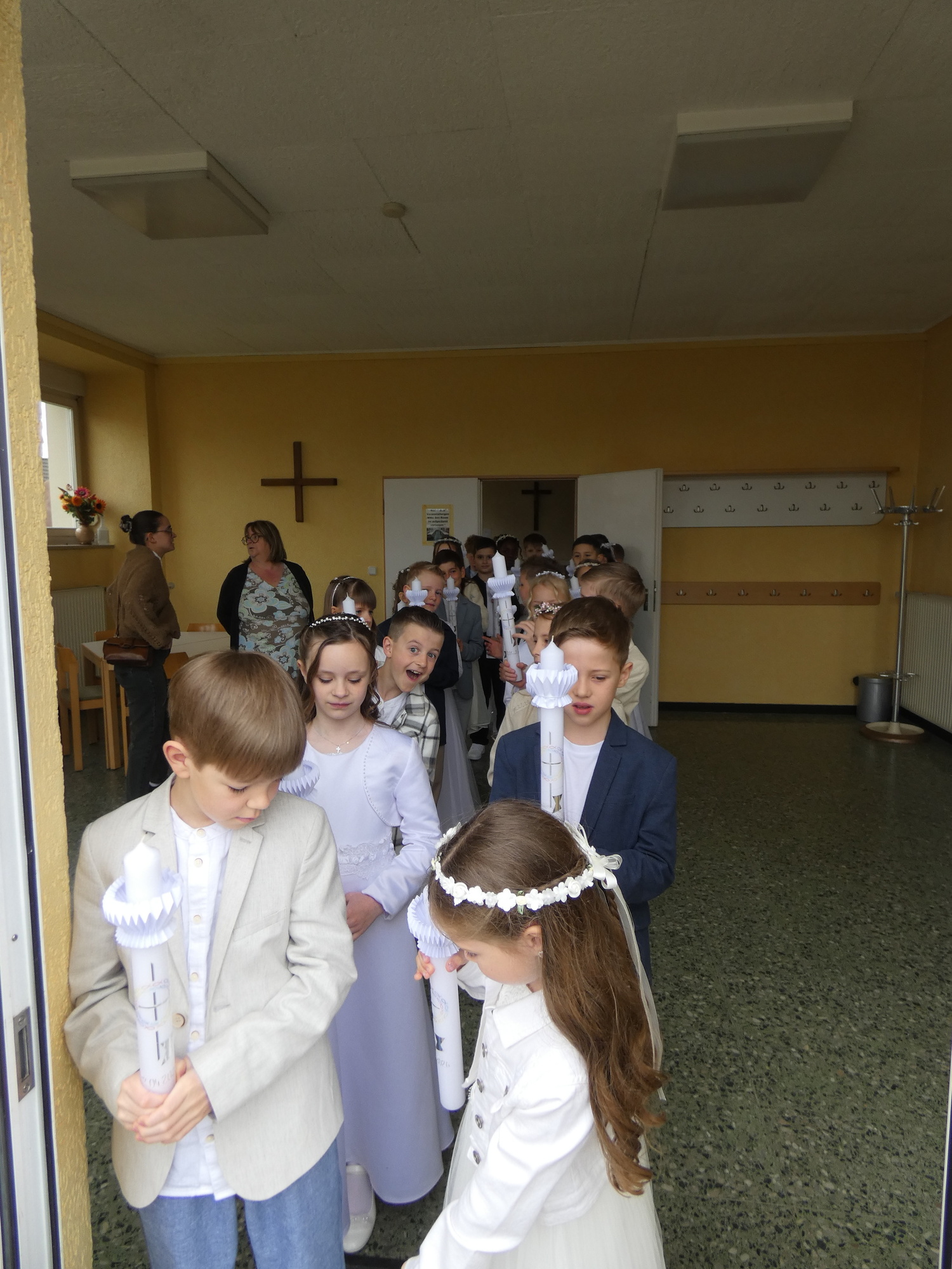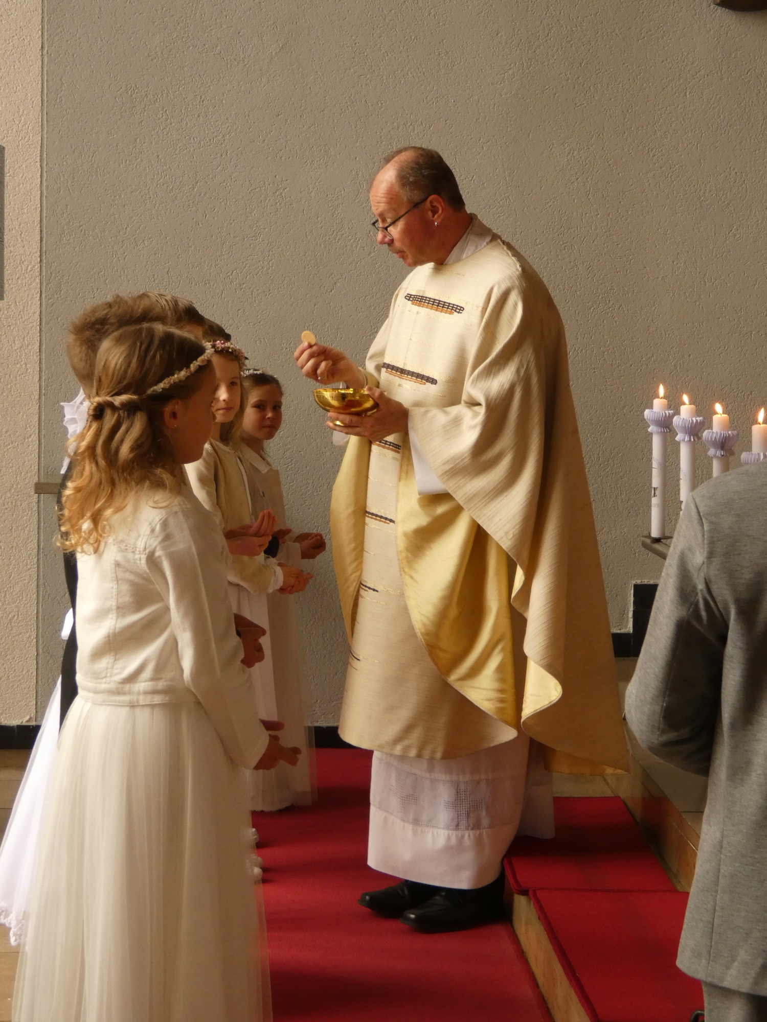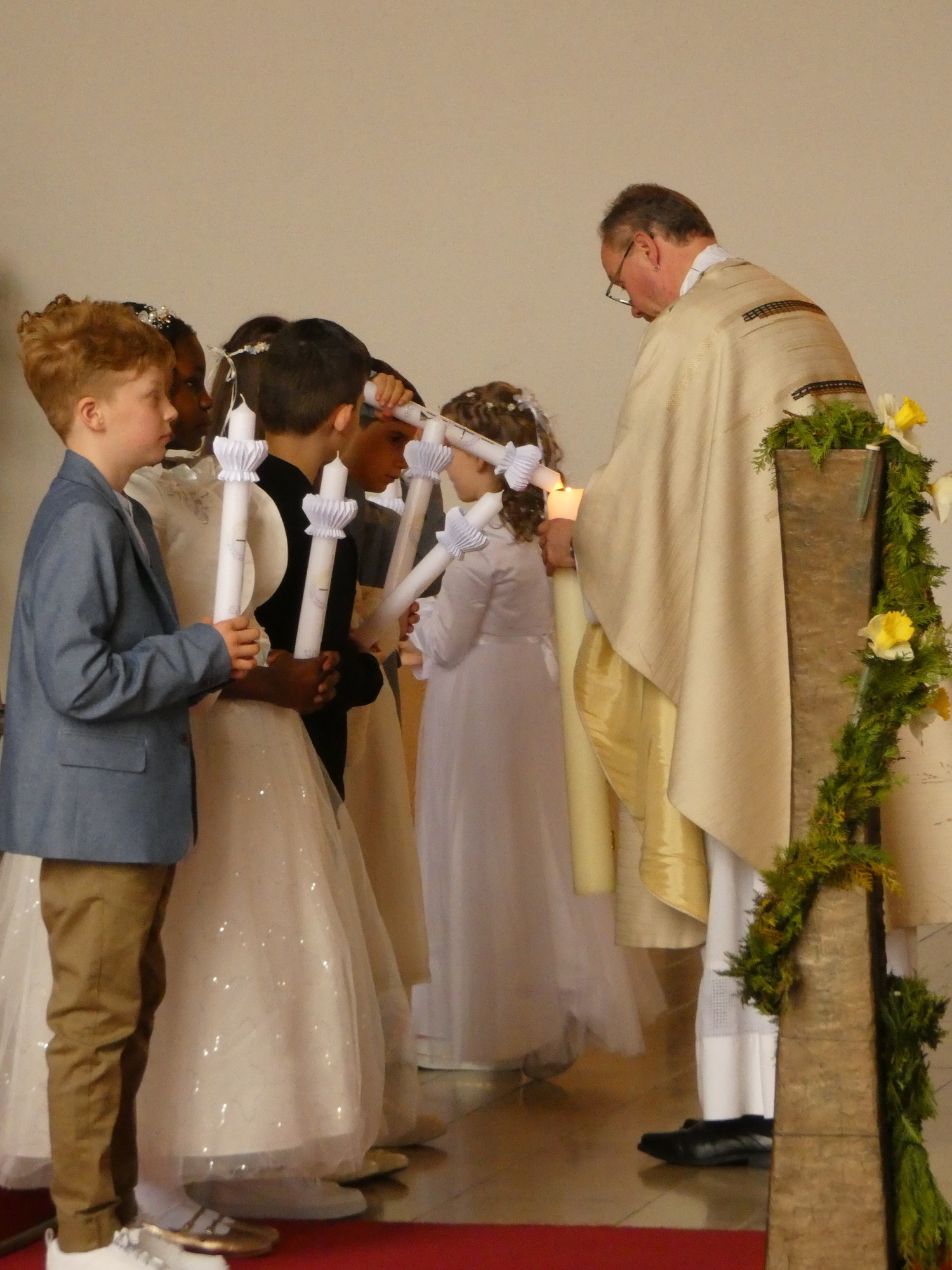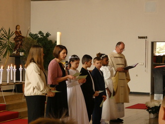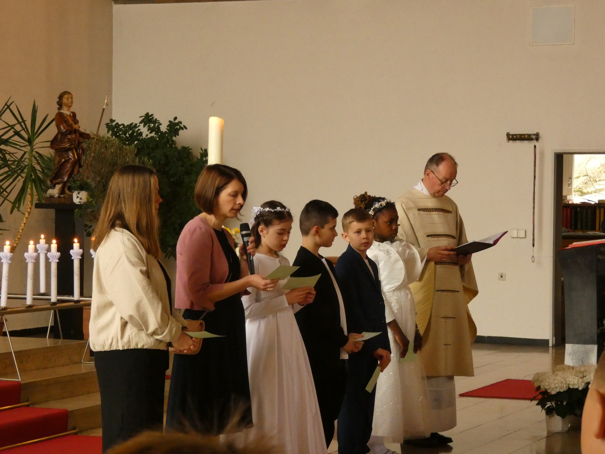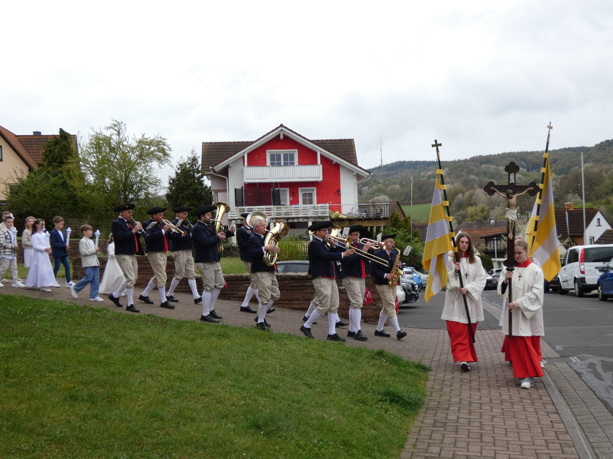 In den zurückliegenden Wochen wurden sie von Pfarrer Michael Prokschi wie auch dem Team der Katechetinnen begleitet und auf diesen Tag vorbereitet. Die Musikkapelle Keilberg spielte auf dem Weg zur Kirche und im voll besetzten Gotteshaus in Straßbessenbach fand der feierliche Gottesdienst statt. Zu Beginn entzündeten die Kinder ihre Kerzen an der Osterkerze und diese wurden dann rund um den Altar aufgestellt. Die Kinder brachten sich bei den Kyrierufen wie auch bei den Fürbitten ein, zum Vater unser und zum Empfang der Kommunion waren alle mit um den Altar versammelt. Der Festgottesdienst wurde musikalisch umrahmt von Niklas Steinzer an der Orgel sowie von den Trompetern Sebastian Lang und Klaus Winkel.